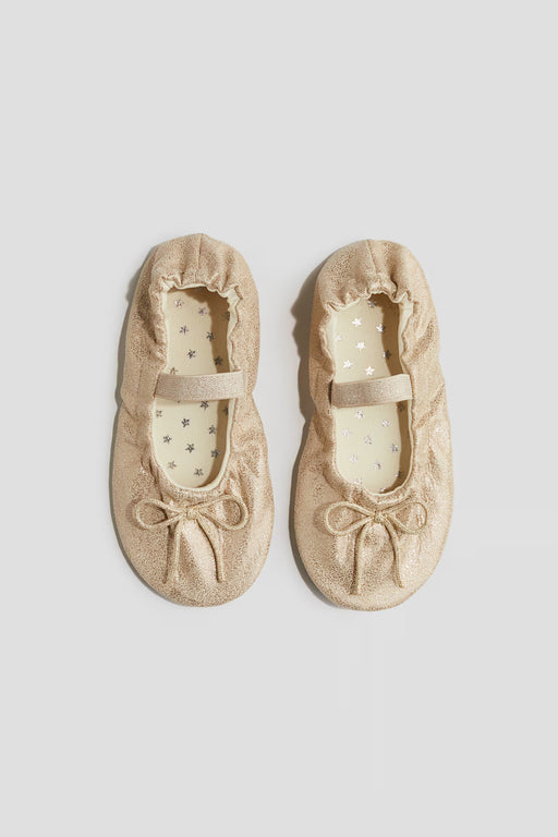 Ver todos los detallesZapatillas de ballet con acabado metalizado brillante. Lazo decorativo delante, tira elástica con glitter en el empeine y elástico en la abertura. ...