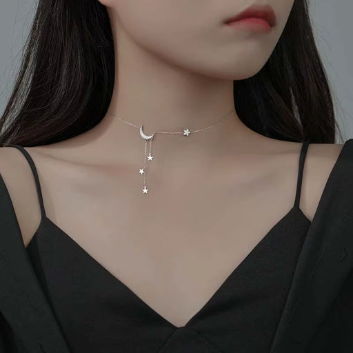 Este elegante collar de clavícula combina diseño celestial con acabado plateado de alta calidad. Presenta delicadas borlas en forma de luna y estre...