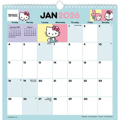 Aspectos destacados Este calendario de pared en espiral de Hello Kitty y sus amigos de 2026 incluye 12 páginas de calendario mensuales de ener...