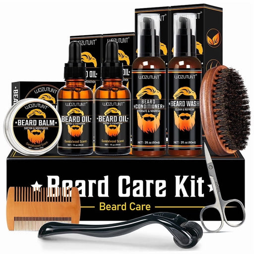 Kit de barba Wozutunt para hombre, set de cuidado y recorte con champú, aceite, bálsamo, cepillo, peine y tijeras