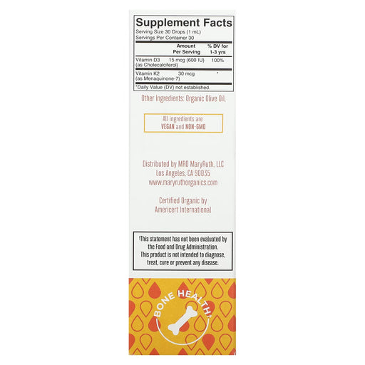 Gotas líquidas de vitamina D3 + K2 orgánicas para niños pequeños de MaryRuth's, 30 ml