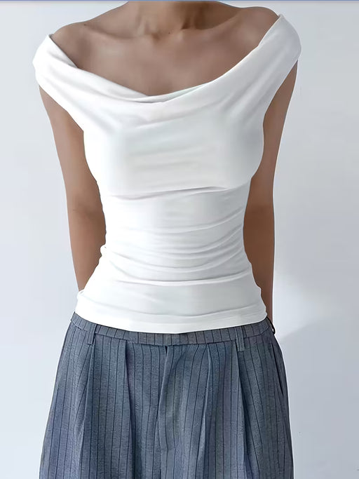Camiseta sin hombros para mujer con volantes - Ajuste ceñido, color sólido