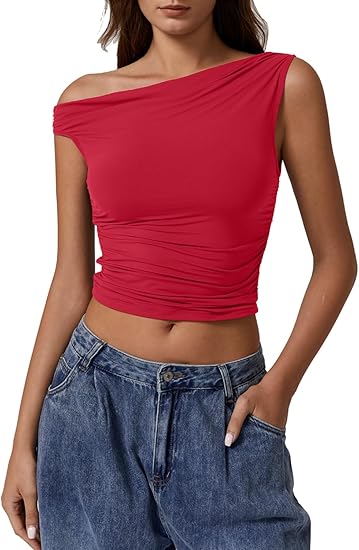 QINSEN Camiseta básica sin mangas con un hombro para mujer