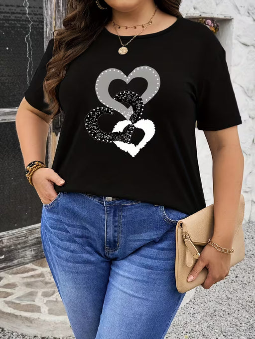 Camiseta Casual Negra de Talla Grande para Mujer - Diseño de Corazón y Corazón Brillante