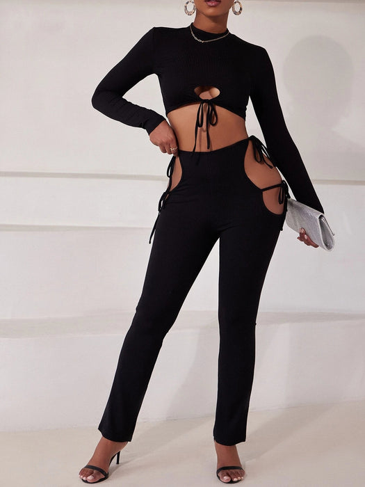 Conjunto de top corto con cuello simulado y pantalones laterales con nudo